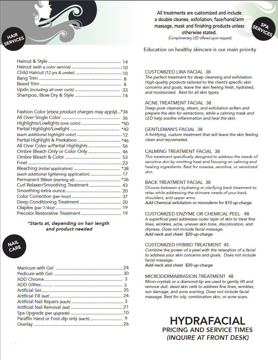 Our available services are below. Please TEXT our front desk staff with any questions or to book your appointment: 208.658.1115 (text only please).
